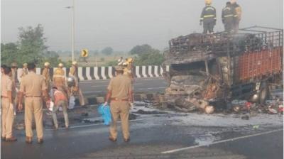 चंद सेकंड में मौत का मंजर: कैंटर से टकराई कार बनी आग का गोला, यात्रियों को नहीं मिला बचने का मौका