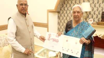 राज्यपाल मंगुभाई पटेल से उत्तरप्रदेश की राज्यपाल आनंदीबेन पटेल की सौजन्य भेंट