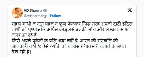 मध्य प्रदेश भाजपा अध्यक्ष वीडी शर्मा ने कहा, '' राहुल गांधी ने जूते पहन व फूल फेंककर जिस तरह अपनी दादी इंदिरा गांधी को पुष्पांजलि अर्पित की, इससे उनकी सोच और संस्कार साफ नजर आ रहे हैं. जिसे अपने पूर्वजों के प्रति श्रद्धा नहीं है, भारत की संस्कृति की जानकारी नहीं है; ऐसे व्यक्ति को कांग्रेस प्रधानमंत्री बनाने के सपने देख रही है.''