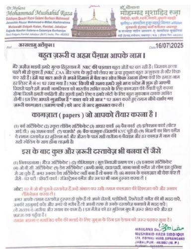 मध्य प्रदेश में मुस्लिम धर्म गुरु मुफ्ती ए आजम डॉ. मौलाना मुसाहिद रजा का एक पत्र सोशल मीडिया पर वायरल हो रहा है, जिसमें उन्होंने प्रदेश के मुसलमानों को सभी पहचान संबंधित दस्तावेजों को सुधरवाने की अपील की है। बिहार में मतदाता सूची शुद्धिकरण के नाम पर चल रहे अभियान ने पूरे मुस्लिम समाज को चिंता में डाल दिया है। यही कारण है कि मध्यप्रदेश के मुफ्ती ए आजम डॉ. मौलाना मुसाहिद रजा ने तमाम मुस्लिम बंधुओं को एक पत्र जारी किया है। सोशल मीडिया पर वायरल हो रहे पत्र को 16 जुलाई 2025 को जारी होना बताया जा रहा है। पैगाम में सभी मुसलमानों से देश की नागरिकता सिद्ध करने वाले तमाम कागजात पहले से दुरुस्त करने की ताकीद की गई है। पत्र के माध्यम से जारी पैगाम में मुफ्ती ए आजम डॉ मौलान मुसाहिज रजा की जानिब से कहा गया है कि, मेरे अजीज भाइयों हमारे मुल्क हिंदुस्तान में एनआरसी की पड़ताल बहुत जोरों पर चल रही है (जिसका हल्ला पहले भी हो चुका है) एनआरसी, सीएए और एनपीआर के मुद्दों को लेकर भाजपा हुकूमत बहुत उत्सुकता से गौर फिक्र कर रही है। हमें यह बात अच्छे से अपने दिमाग में बैठा कर सोच फिक्र रखना होगा। क्योंकि हमारा नाम हर लिस्ट में नं 01 पर रखा गया है। एनआरसी किसी भी समय हमारे सूबे मध्य प्रदेश में शुरू हो जाएगी जिससे पहले हमें अपनी नागरिकता को भारतीय साबित करने के लिए कागजात की तैयारी पूरी करना होगा जिसमें हमारी काहिली और सुस्ती हमारे लिए व हमारे छोटों के लिए बहुत नुकसान दायक साबित होगी।