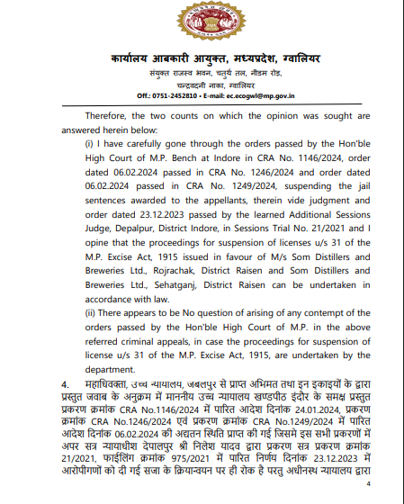 हालांकि आबकारी आयुक्त कार्यालय ने स्पष्ट किया कि सजा निरस्त नहीं की गई है लाइसेंस निलंबन पर कोई रोक नहीं है अधीनस्थ न्यायालय का दोषसिद्धि आदेश यथावत है महाधिवक्ता से प्राप्त अभिमत एवं हाईकोर्ट आदेशों की समीक्षा के बाद यह निष्कर्ष निकाला गया।