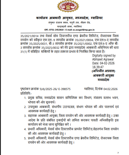 यह आदेश आबकारी आयुक्त अभिजीत अग्रवाल द्वारा दिनांक 04 फरवरी 2026 को जारी किया गया
